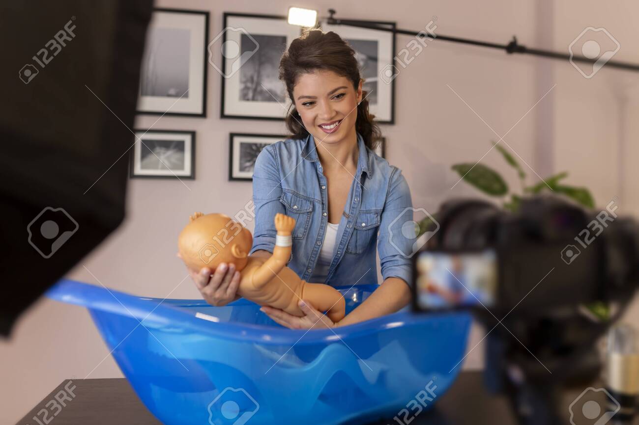 Female Vloger Recording Video About Newborn Baby Bathing As Part Of Online Prenatal Classes Female Influencer Filming Tutorial About Newborn Baby Care Stock Photo Picture And Royalty Free Image Image 136978532
